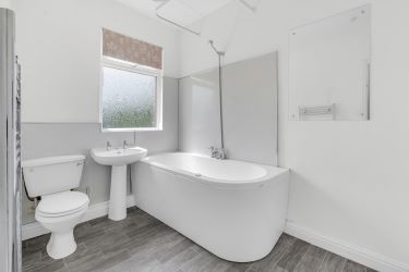 Upstairs, the first floor hosts a large family bathroom complete with bath, separate shower, WC, and basin, along with a generously sized double bedroom decorated in calm, neutral tones.