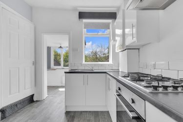 The well-proportioned kitchen benefits from ample storage and enjoys a lovely outlook to the rear terrace leading onto open fields—a rare and desirable feature. Additional internal storage can be found in a useful closet, while a rear extension provides access to the private, low-maintenance garden, arranged in a split-level design ideal for relaxing or entertaining.